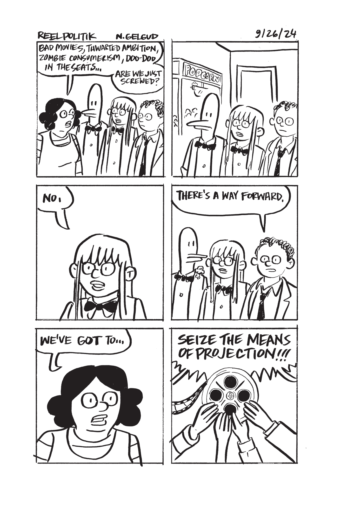 Nathan Gelgud has been a projectionist, a video store clerk, and a movie critic. In 2012, he came in second place for the AltWeekly Award in Arts Criticism. He pretty much quit film criticism right after that. He makes comics about the arts for the New York Times and Hyperallergic when they let him. He used to live in New York, now he lives in Los Angeles.