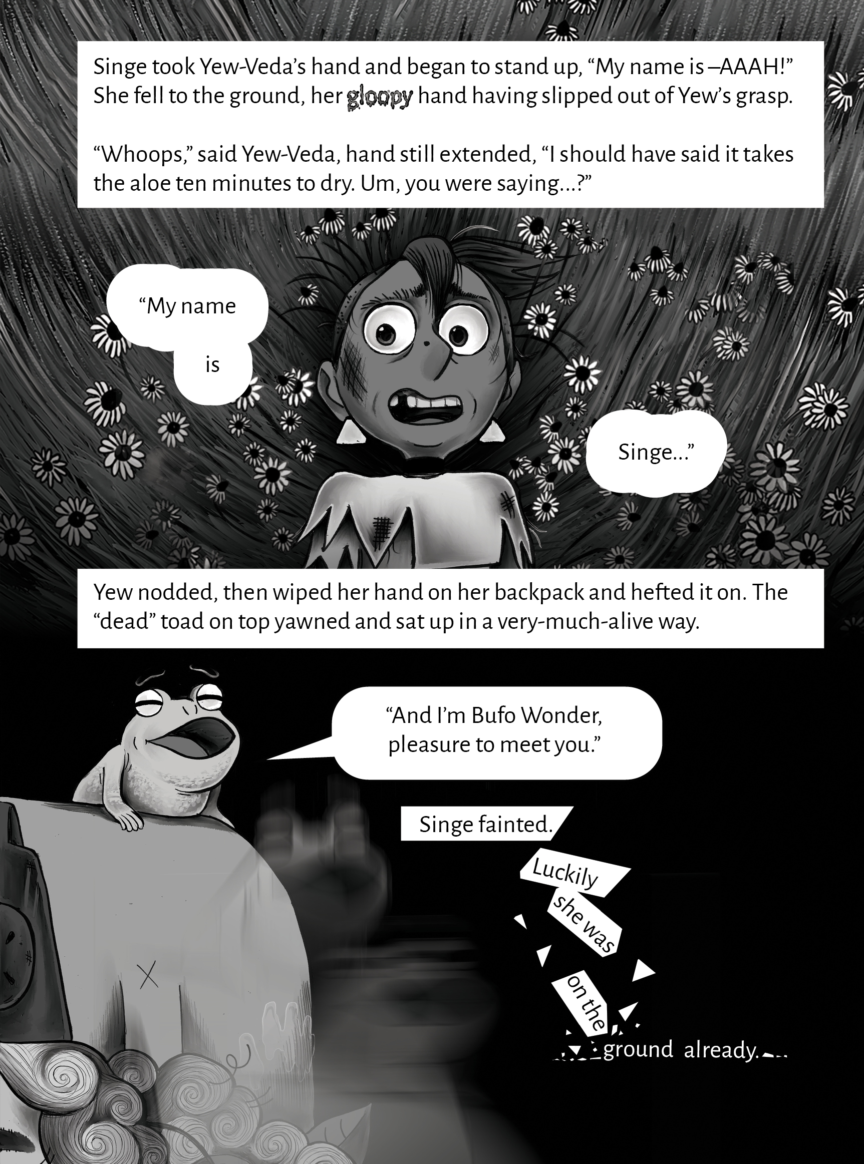 A witch’s work is never done when she works for the people. With the success of her town relying on her magic, demands are high. But what happens when a witch can’t keep up with the magical requests? She is burnt, of course—in a cruel ritual that extinguishes her magic and erases all her memories, making her just like everybody else. But when a burning ceremony is interrupted by rain in Chamomile Valley, a witch is left writhing at the stake. It’s up to a witch doctor and her toad friend to save the singed witch and nurse her back to health. Can they help her before her magic is lost forever?