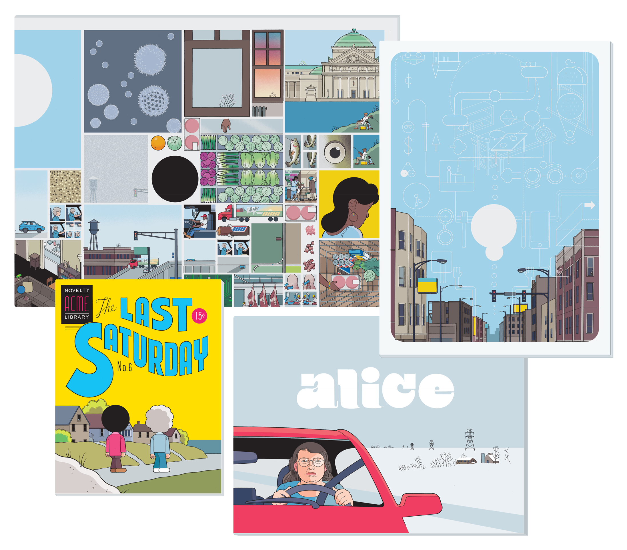 Three securely bound and unaccountably legible 24-page saddle-stitched cartoon booklets accompany a large fold-out comic strip newspaper section, the whole conveniently compacted into an attractively designed keepsake folio allowing for easy disposal and/or tindering in the event of sudden societal collapse. Alice White, The Last Saturday, and a cast of unnamed and almost completely unfamiliar protagonists are all here in little hand-drawn boxes to keep you company on that upcoming rainy afternoon when you watch your hopes, dreams and perhaps even your country go up in smoke.