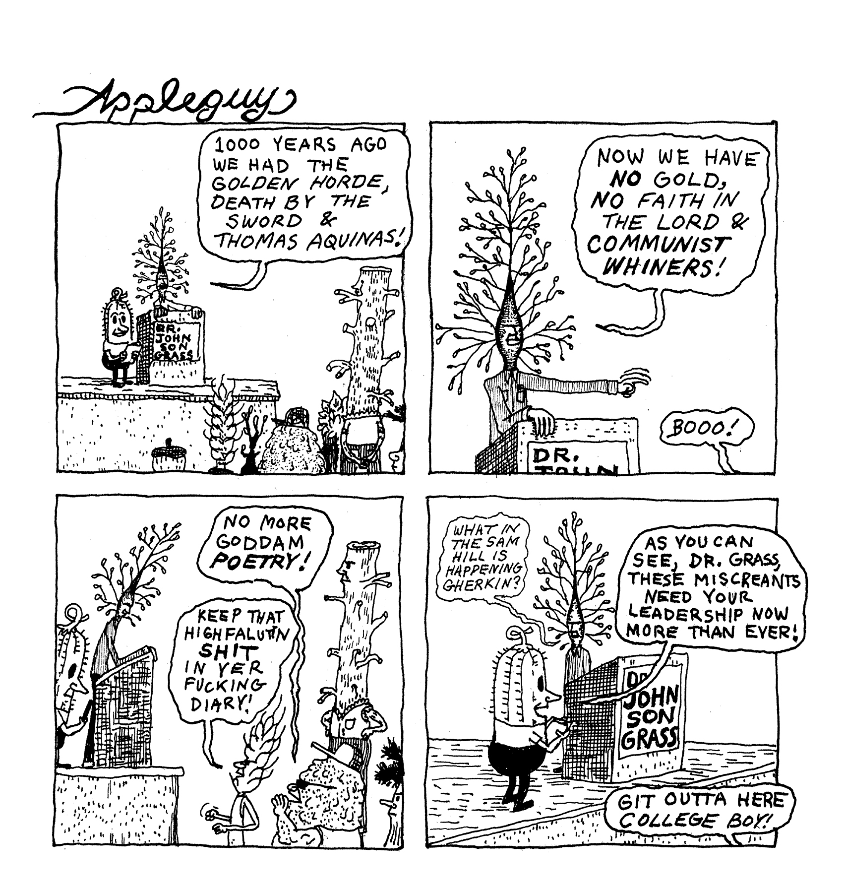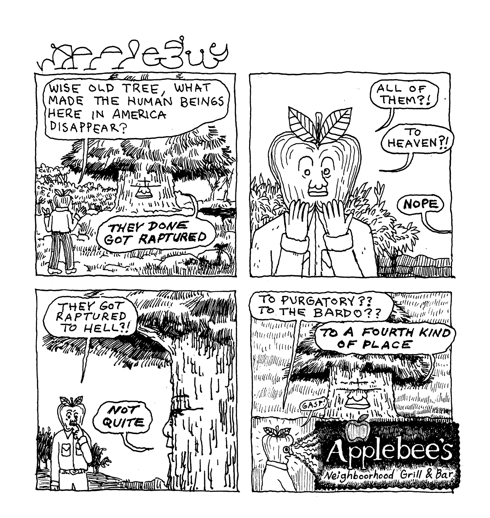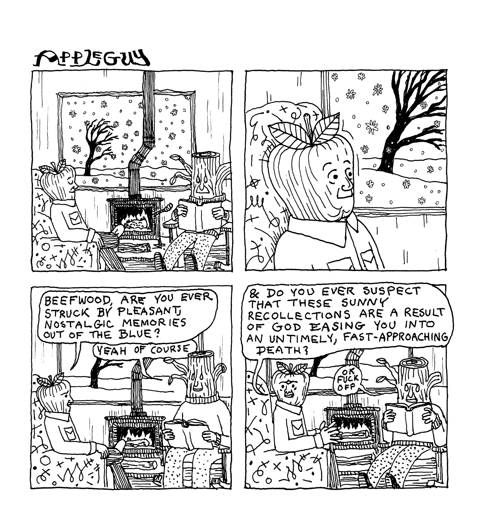 Appleguy & Beefwood’s rapid-fire dialogue and tightly wound humour is reminiscent of classic buddy comics as wide-ranging as Calvin and Hobbes or Mutt and Jeff. Van Tassel’s wiry, delightfully jagged characters walk and talk as the world grows both physically and spiritually around them.Â