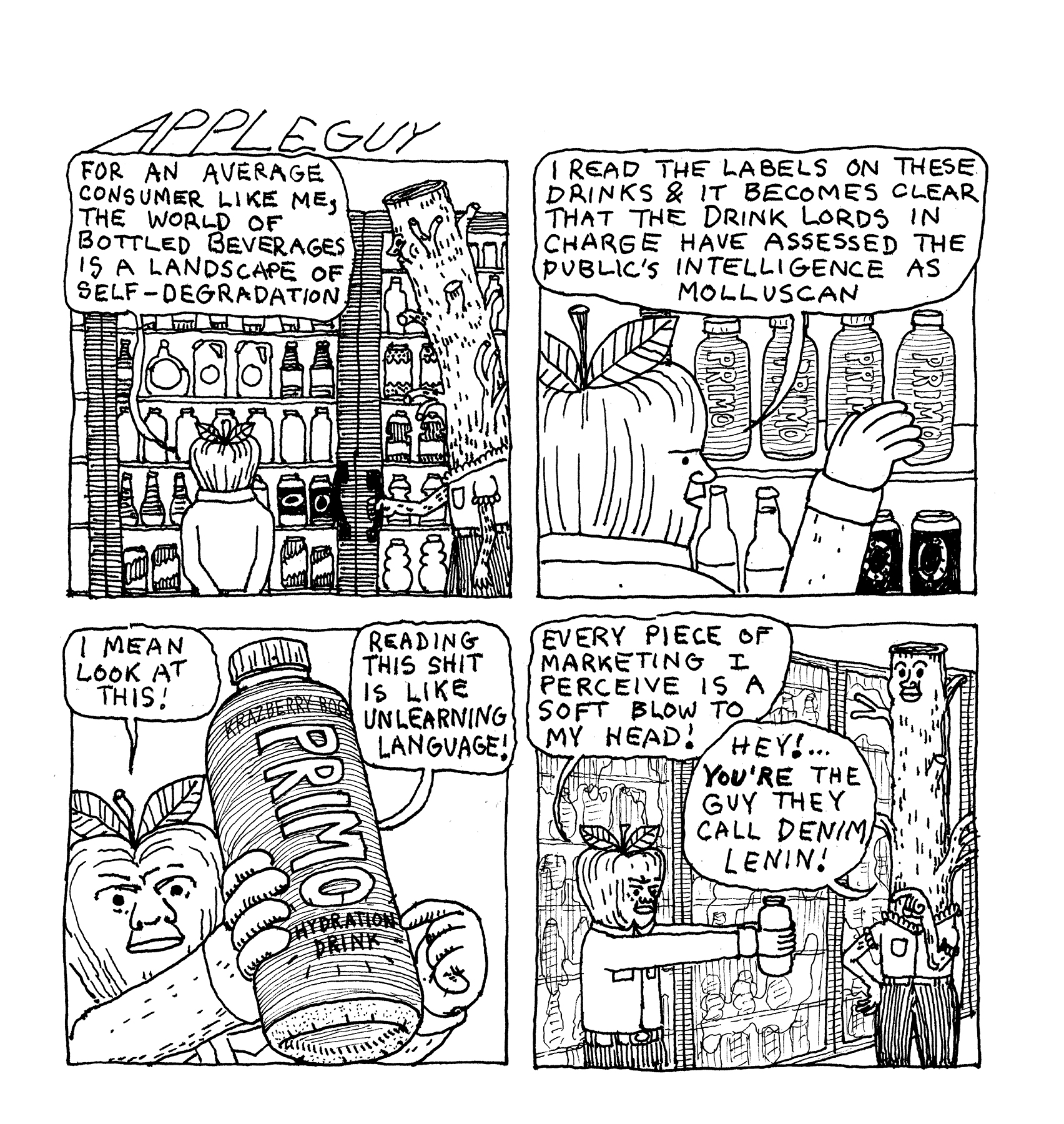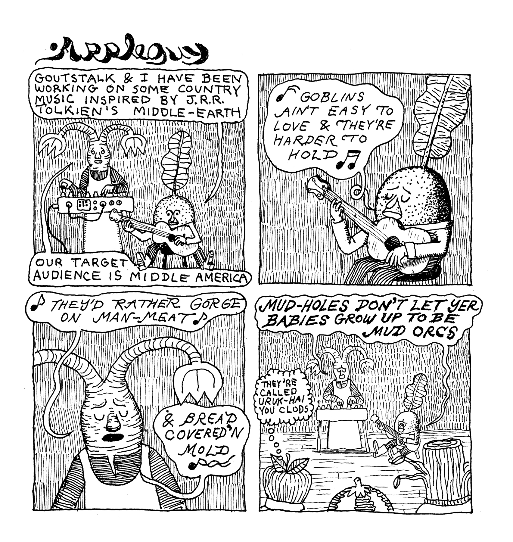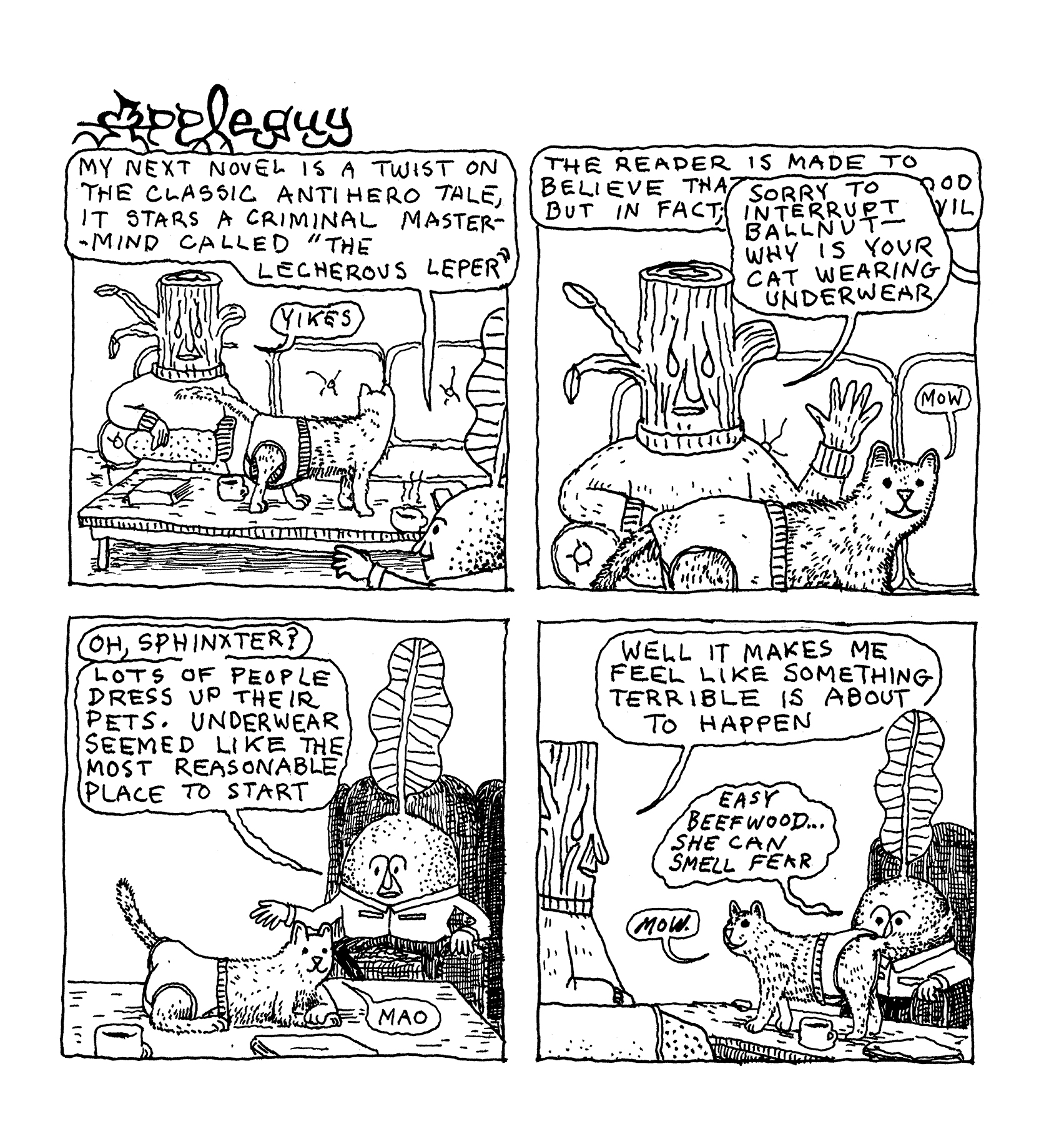 Appleguy & Beefwood’s rapid-fire dialogue and tightly wound humour is reminiscent of classic buddy comics as wide-ranging as Calvin and Hobbes or Mutt and Jeff. Van Tassel’s wiry, delightfully jagged characters walk and talk as the world grows both physically and spiritually around them.Â