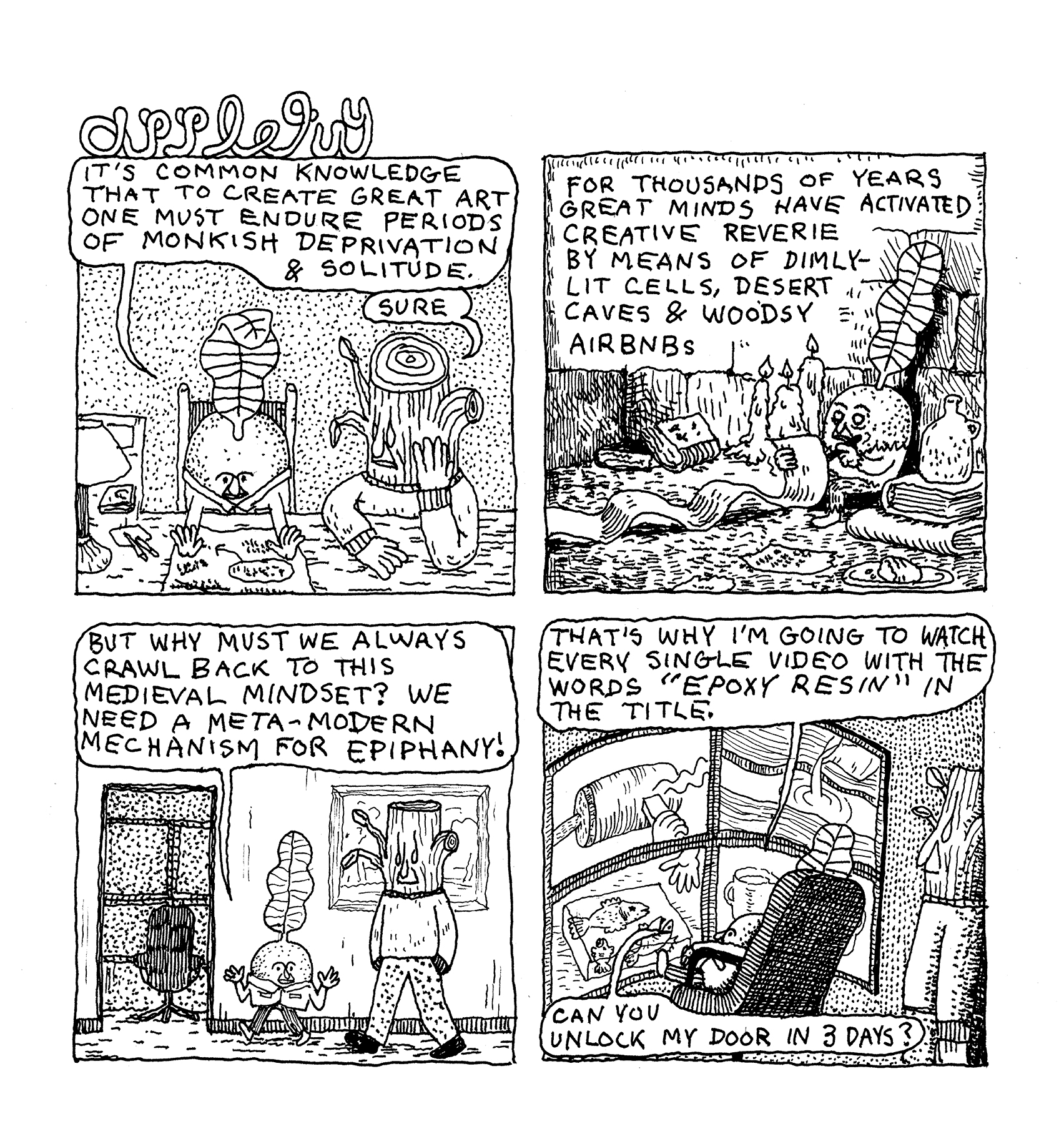This approachably hilarious take on the existential and esoteric distills the absurdities of the modern everyday into four panels with forthright wit and a discerning eye.