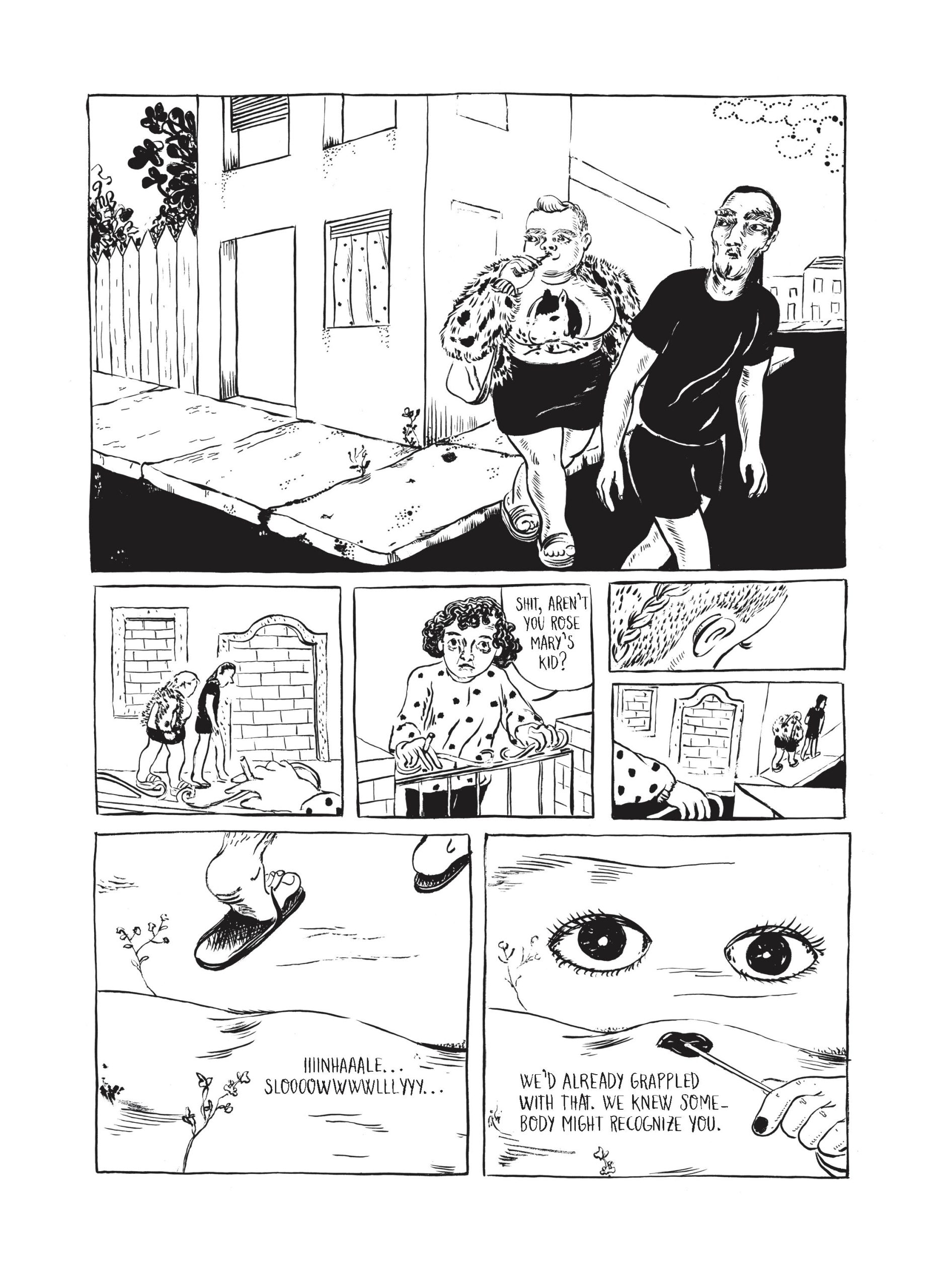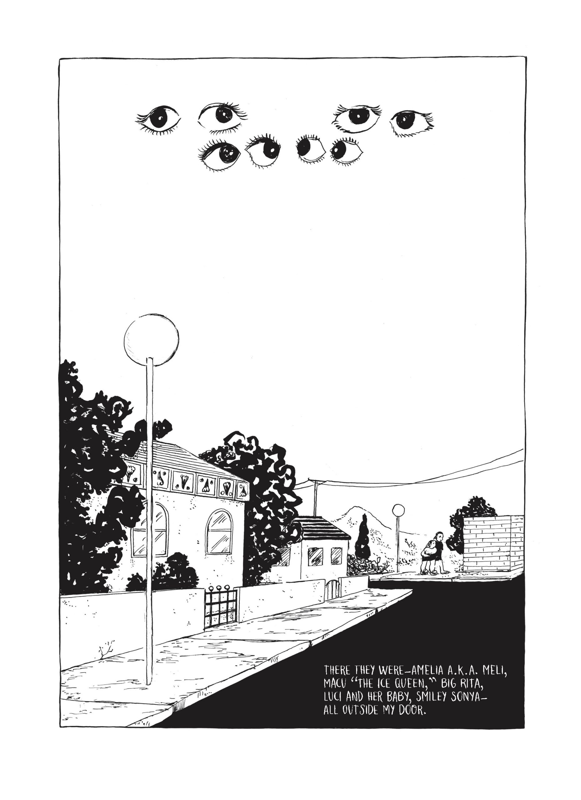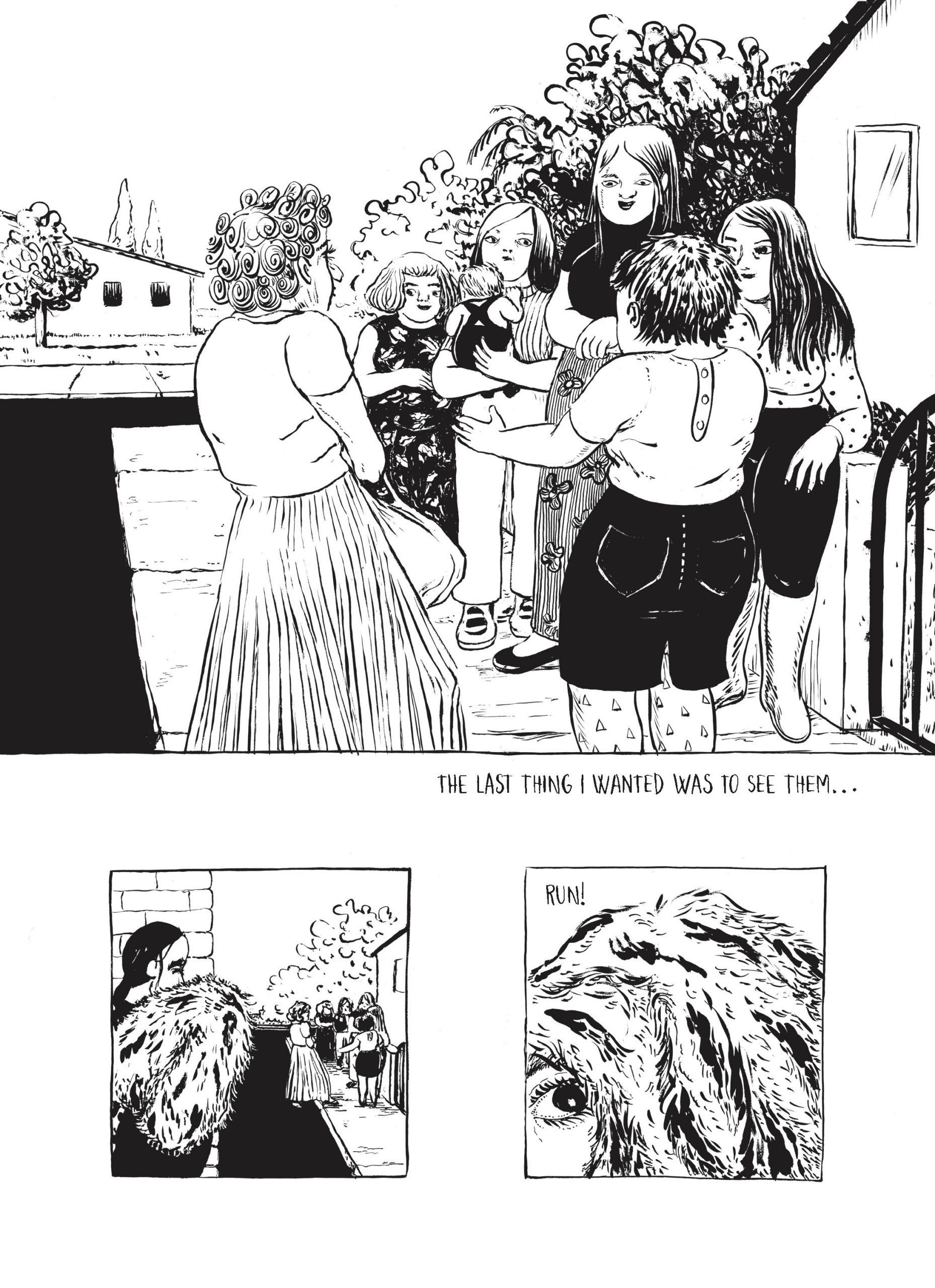 Lola Lorente’s slick black inkwork feels sophisticated and voluptuous, and her rendering of townsfolk and their customs is a sensorial delight. Her devoted attention to fabric textures, body shapes, and one-of-a-kind faces brings this cast of oddballs and weirdos, sometimes verging on the grotesque, fully to life.Â