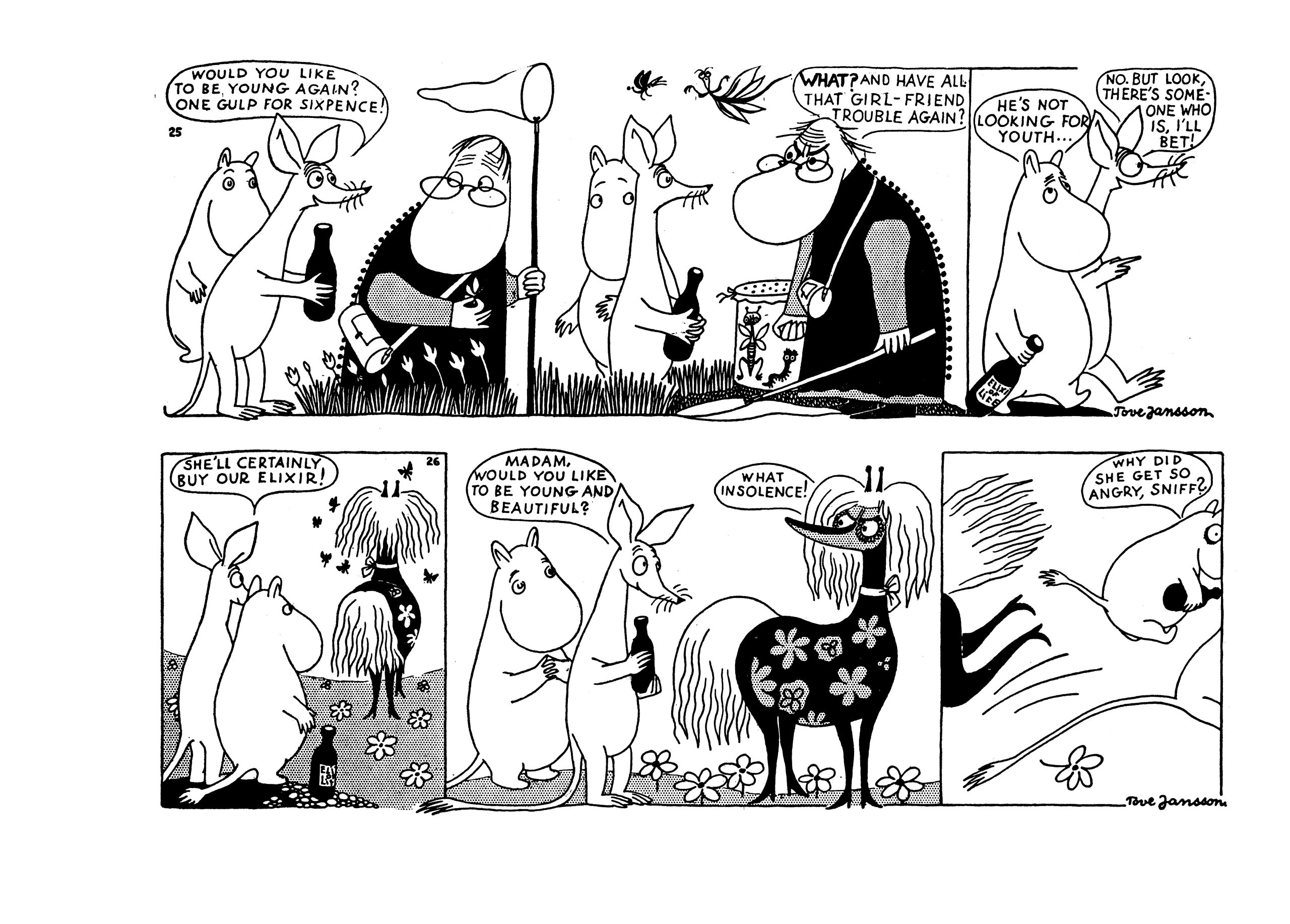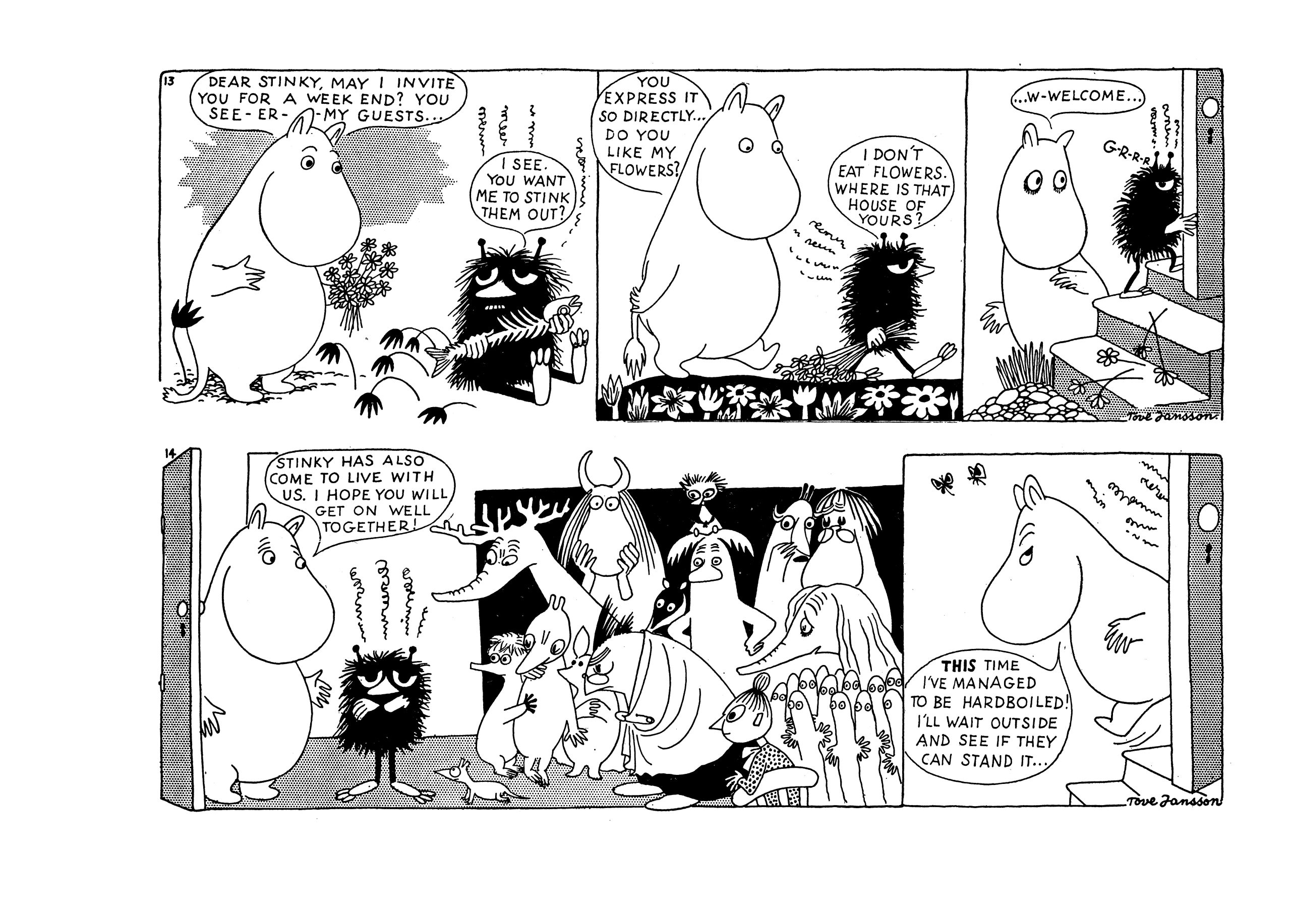 The strip’s gentle humor and subtle yet sharp musings on life relay an utterly human existence through the lives of Moomin, Moominmamma, Moominpappa, Snufkin, Little My, Snork Maiden, and more.