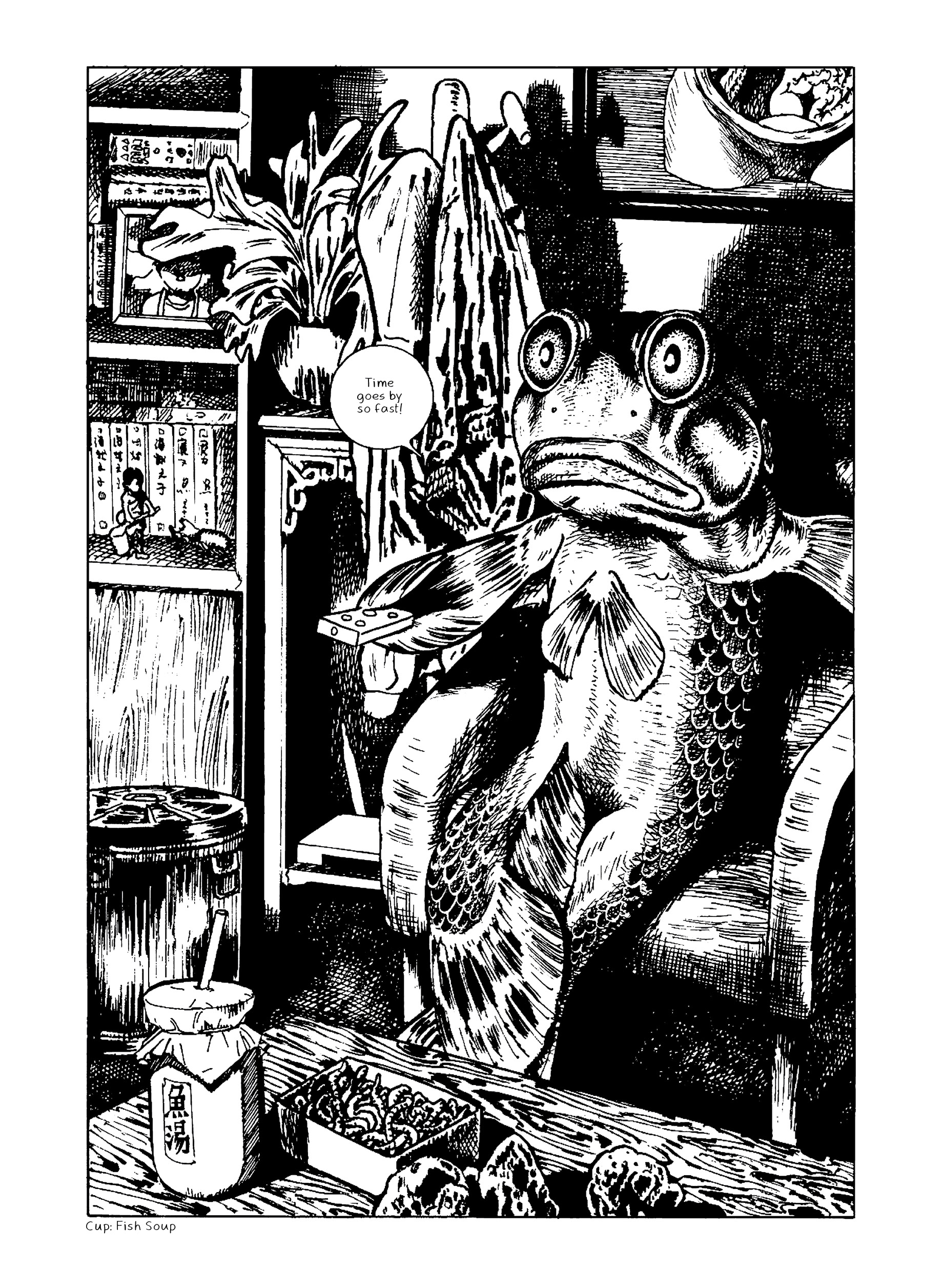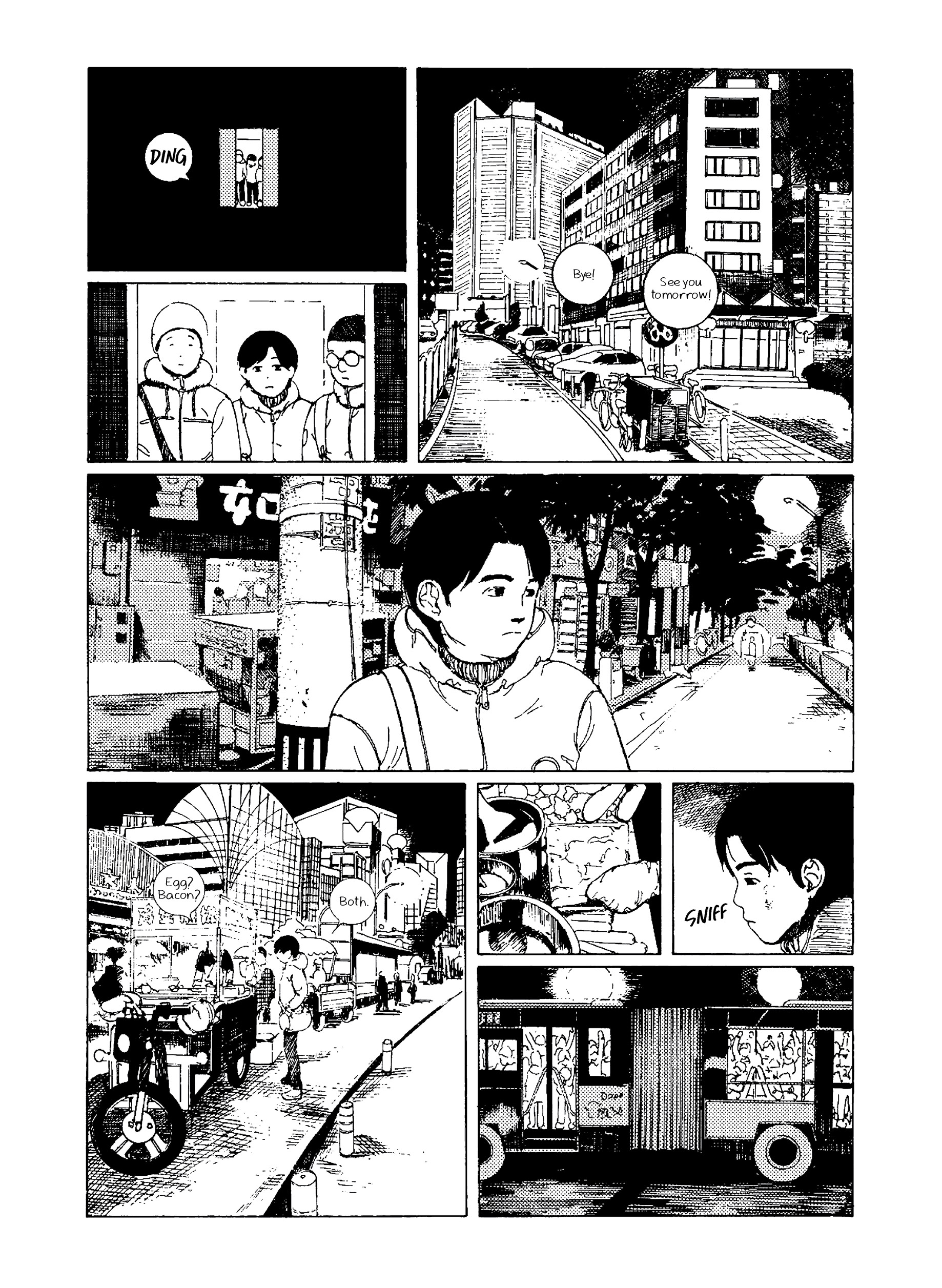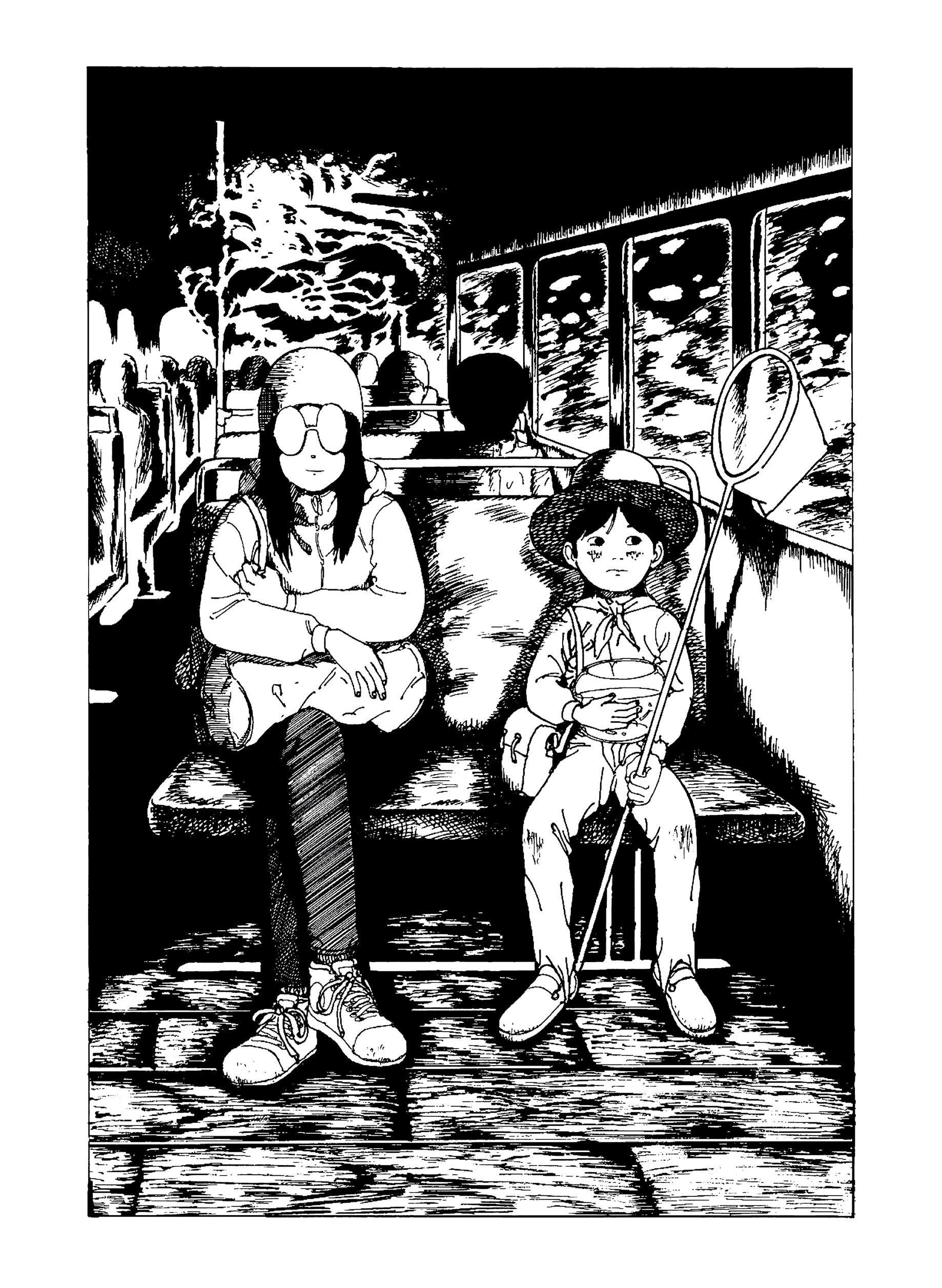 In Night Bus, a young woman wearing round glasses finds herself on an adventurous late night bus ride that constantly makes detours through increasingly fantastical landscapes. Meanwhile a young cartoonist returns home after art school and tries his hand at becoming a working artist while watching over his aging grandmother whose memory is deteriorating. Nostalgic leaps take us to an elementary school gymnasium that slowly morphs into a swamp and is raided by a giant catfish. Beetles, salamanders, and bug-eyed fish intrude upon the bus ride of the round-glasses woman as the night stretches on. Night Bus blends autobiography, horror, and fantasy into a vibrantly detailed surreal world that shows a distinct talent surveying his past.