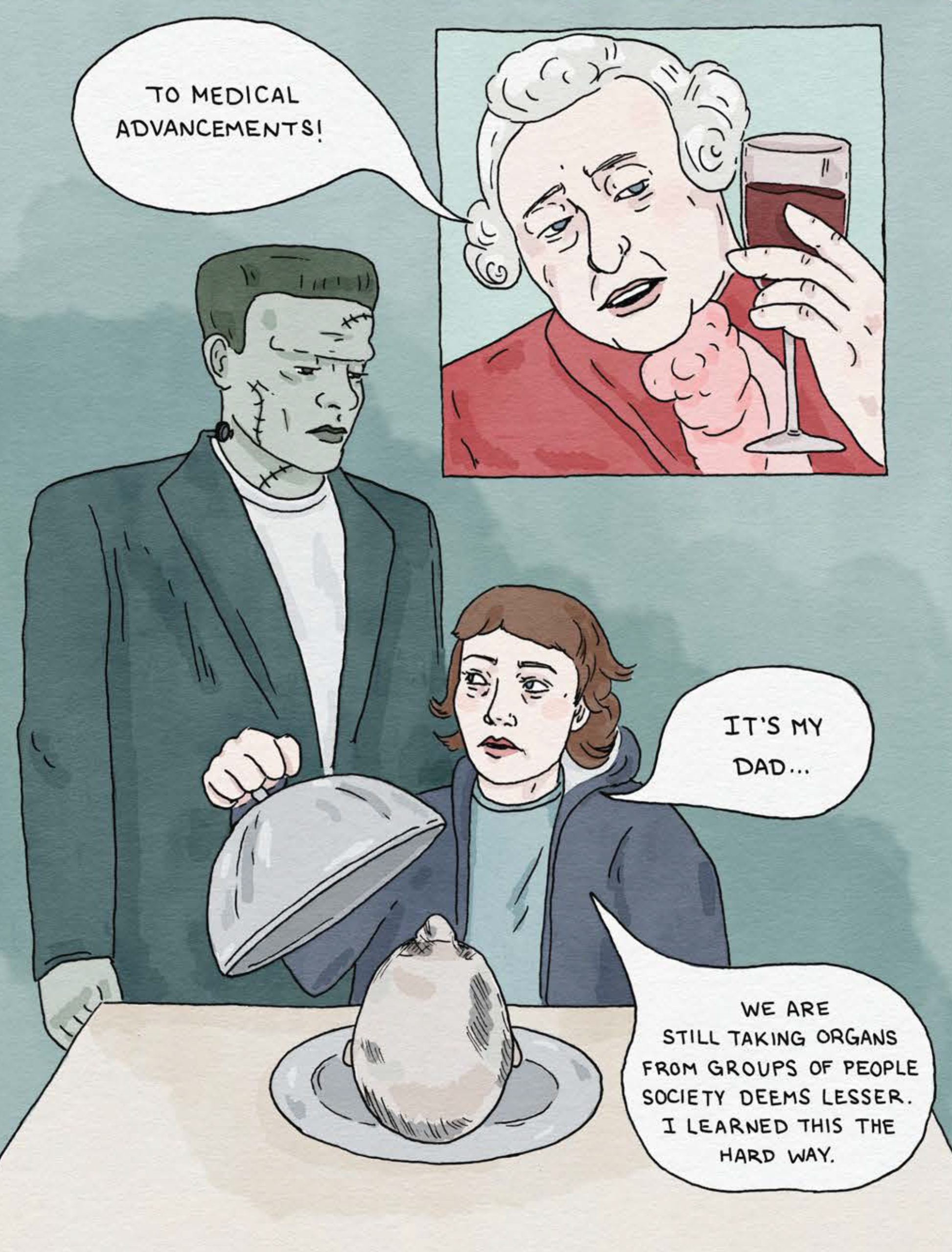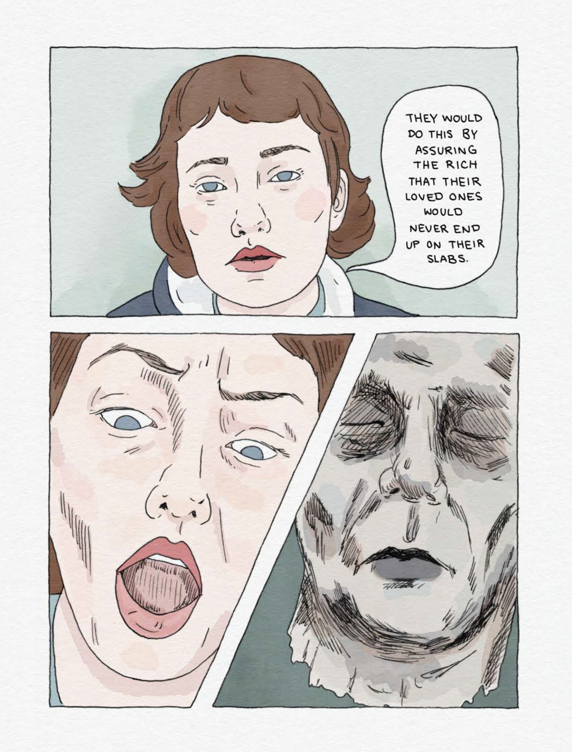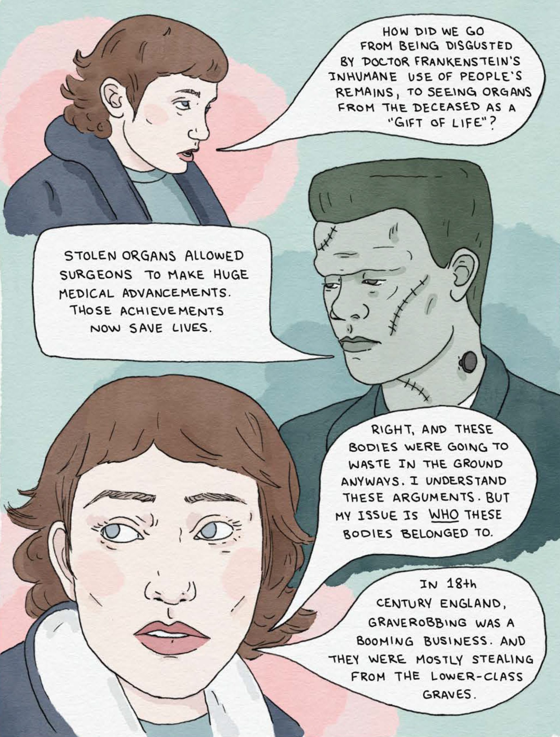 Opioids and Organs is a damning critique of an industry that takes advantage of society’s outcasts. It is also the graphic novel debut of O’Neill herself, who weaves together a dramatic personal history with that of how humanity made its scientific advances. A muted yet striking pastel palette and a dolllike fantastical elegance belie both the gruesomeness of the book’s topic and the rage of its author.
