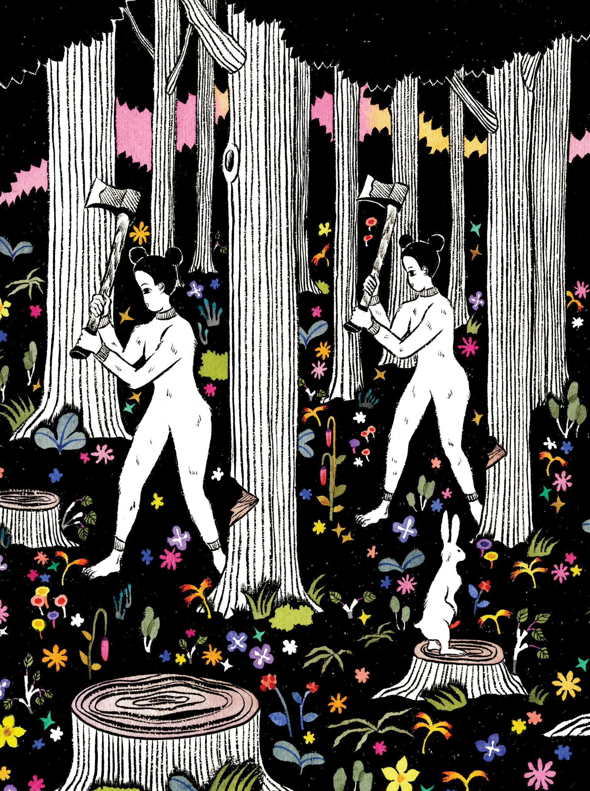 "Rumi Hara's The Peanutbutter Sisters is a celebration of the power, imagination, and ingenuity of women, expressed as a fever dream. In one story, two girls face off in a bubble gum-chewing contest and blow bubbles so big that they consume them; in another, a goddess merely needs to point to trigger a swarm of "Bombadonnas" to create destruction and chaos. The short stories are punctuated by surreal imagery of the Builders at work at a lumberyard, dressed in matching crotchless suits made of fur. Reading it feels like you're going on a psychedelic trip with Hara, and she's taking you by the hand deeper and deeper into her beautiful, magical, fantastical world." — Malaka Gharib, author of I Was Their American Dream and the forthcoming graphic memoir, It Won't Always Be Like This