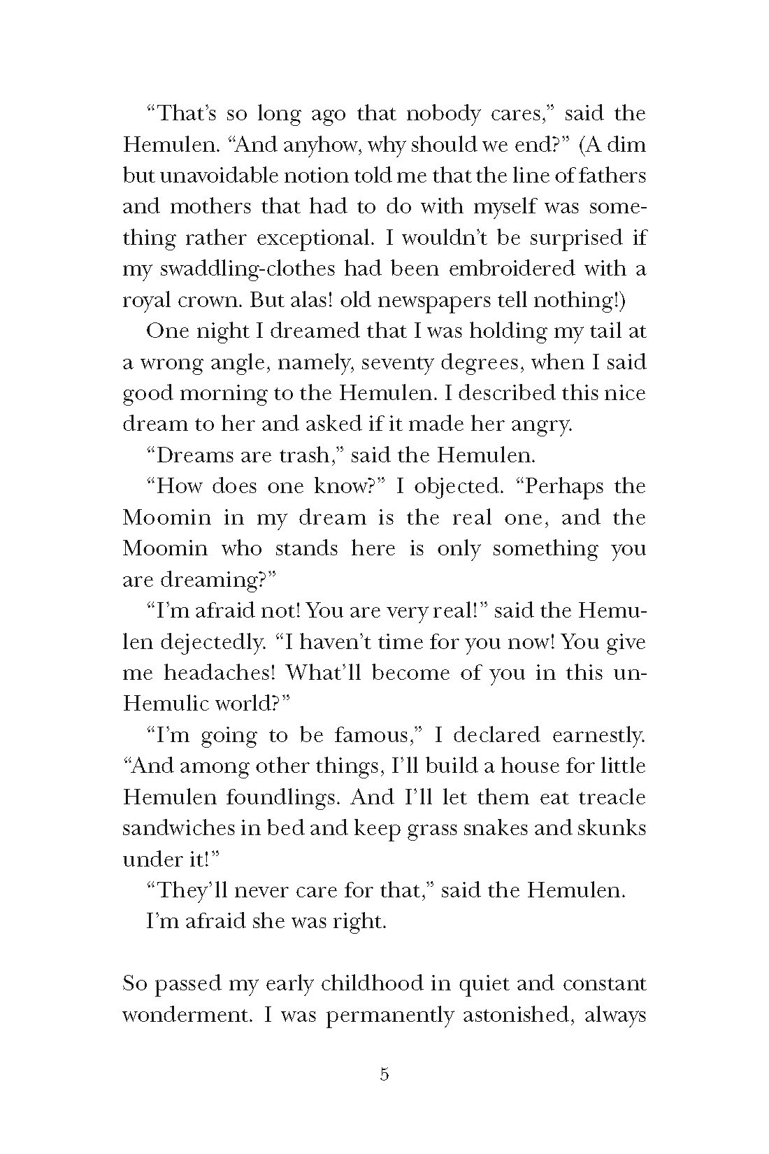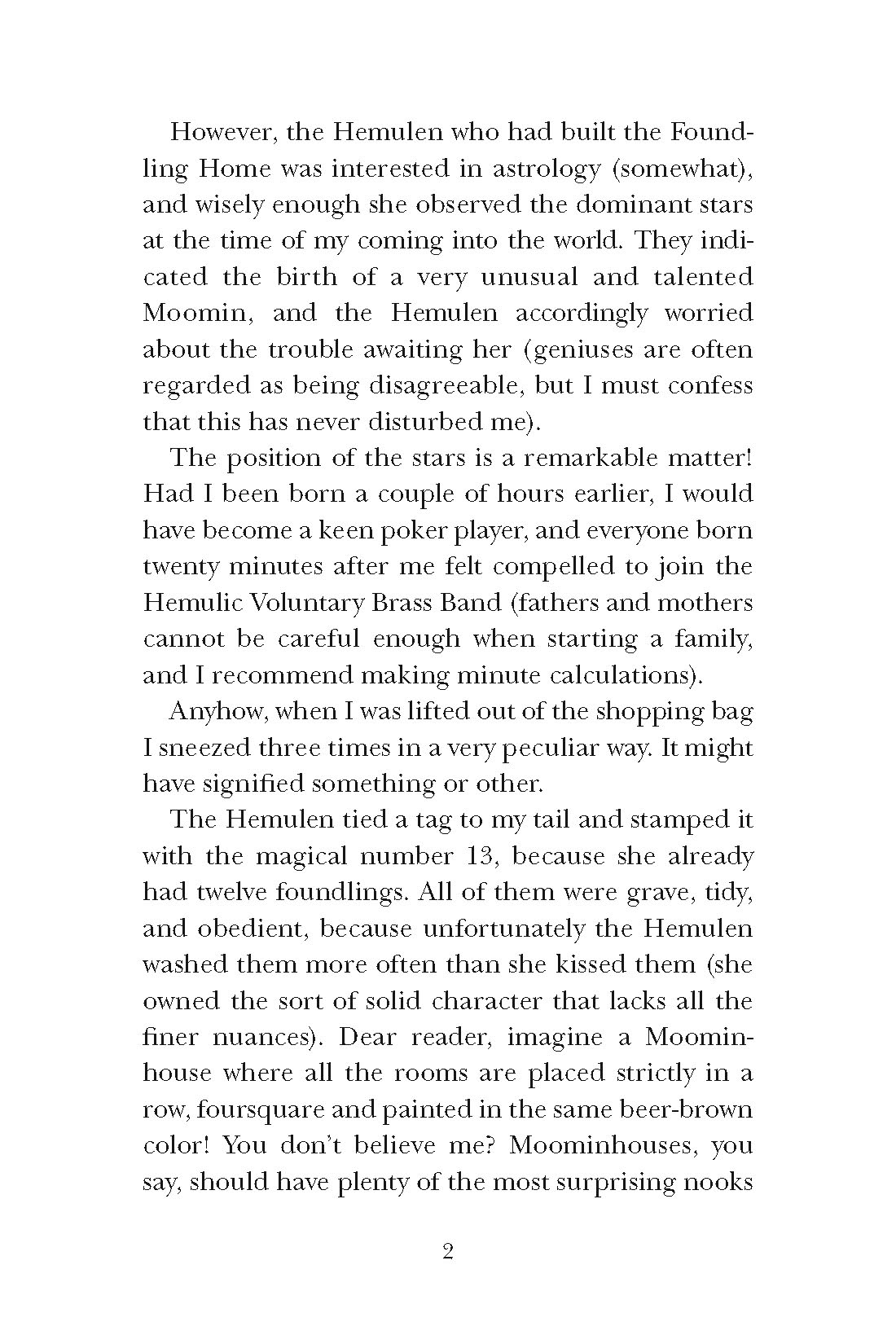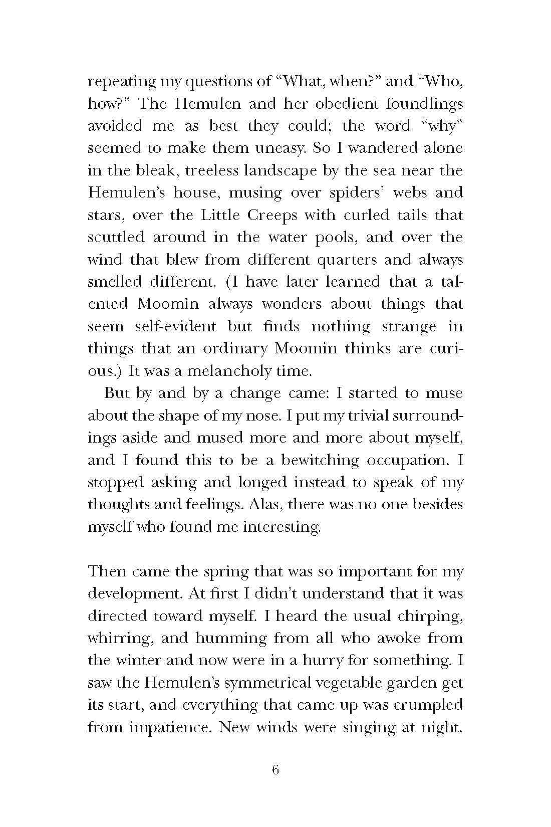 As he reads each chapter aloud to Moomintroll, Snufkin, and Sniff, they–and we–learn of his triumphs and tribulations: his arrival at Hemulin’s orphanage, his momentous meetings with the Joxter, the Muddler, and a cast of other characters too incredible (especially Edward the Booble) to list here.