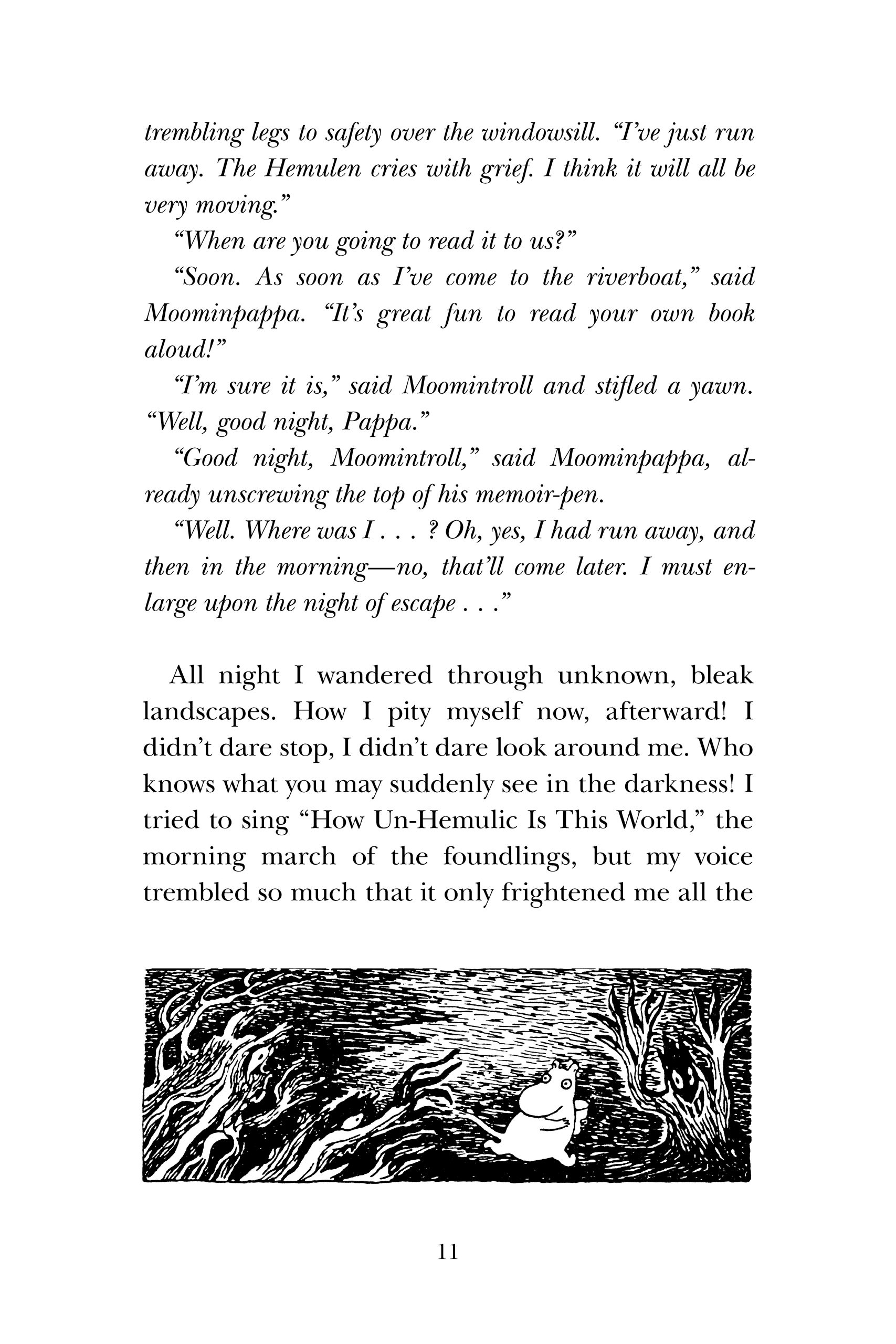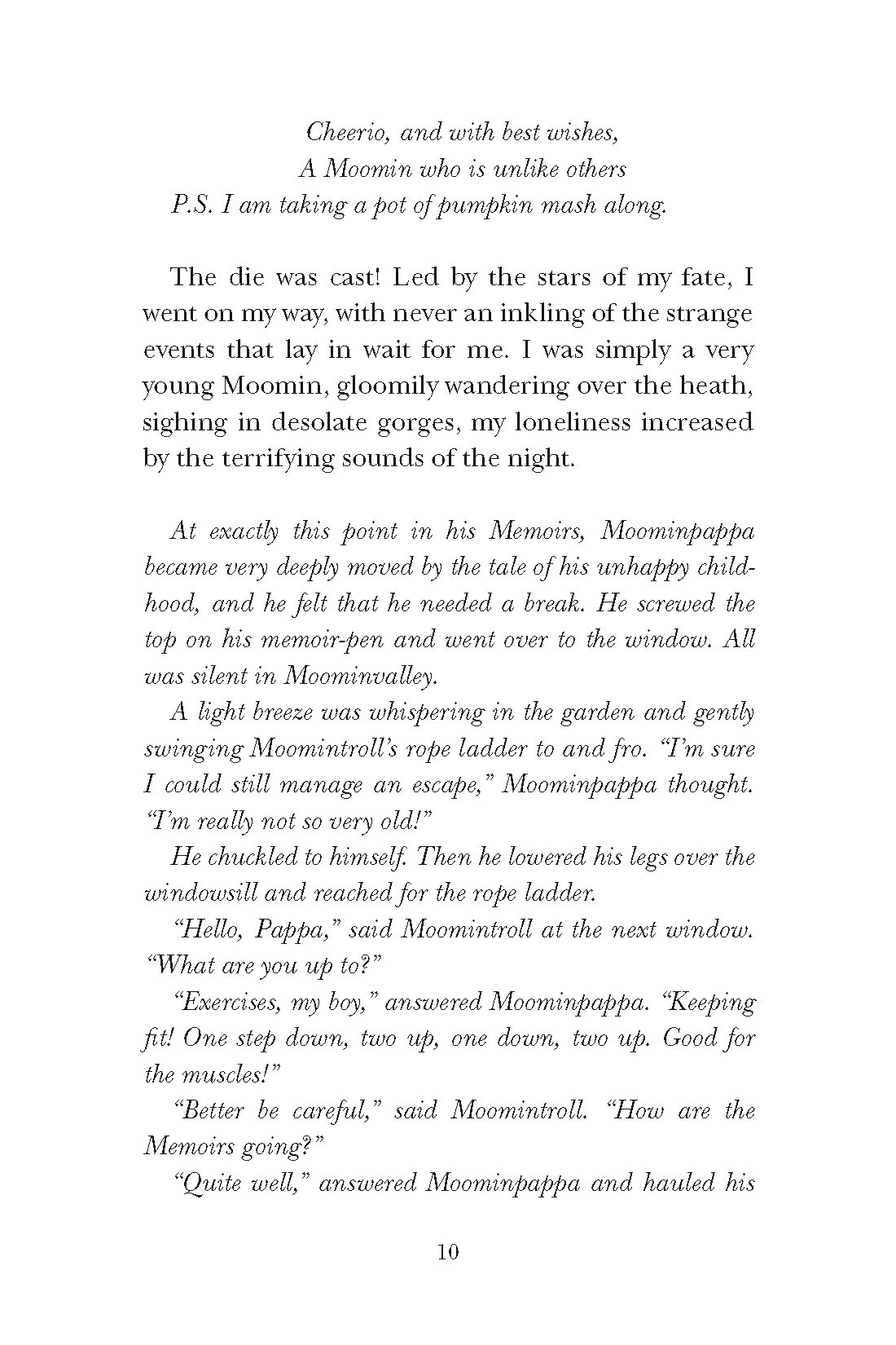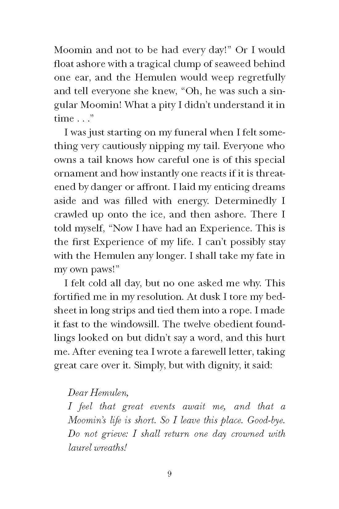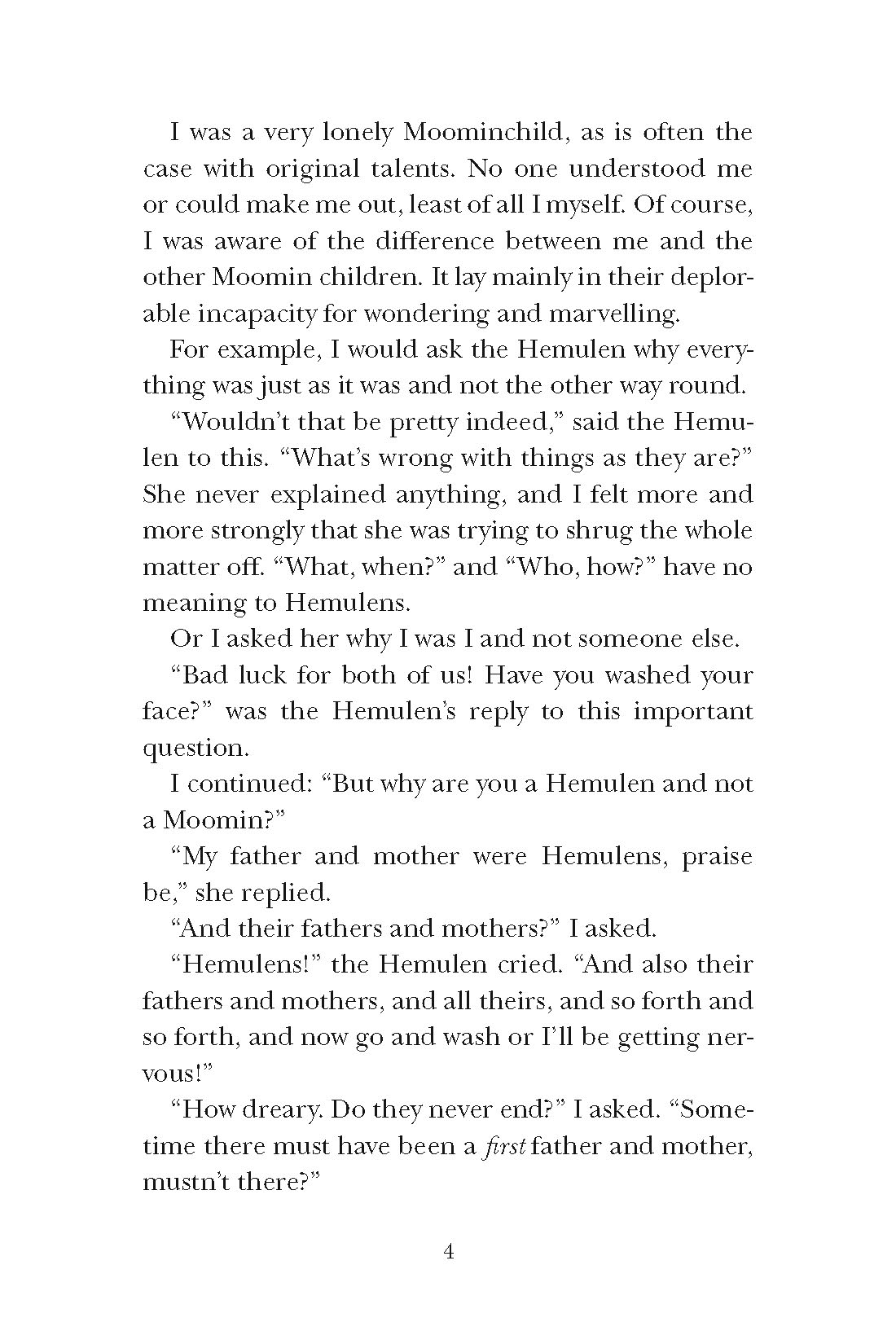 As he reads each chapter aloud to Moomintroll, Snufkin, and Sniff, they–and we–learn of his triumphs and tribulations: his arrival at Hemulin’s orphanage, his momentous meetings with the Joxter, the Muddler, and a cast of other characters too incredible (especially Edward the Booble) to list here.
