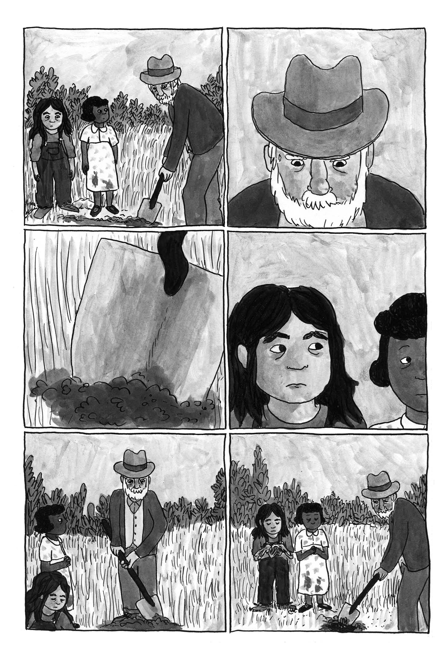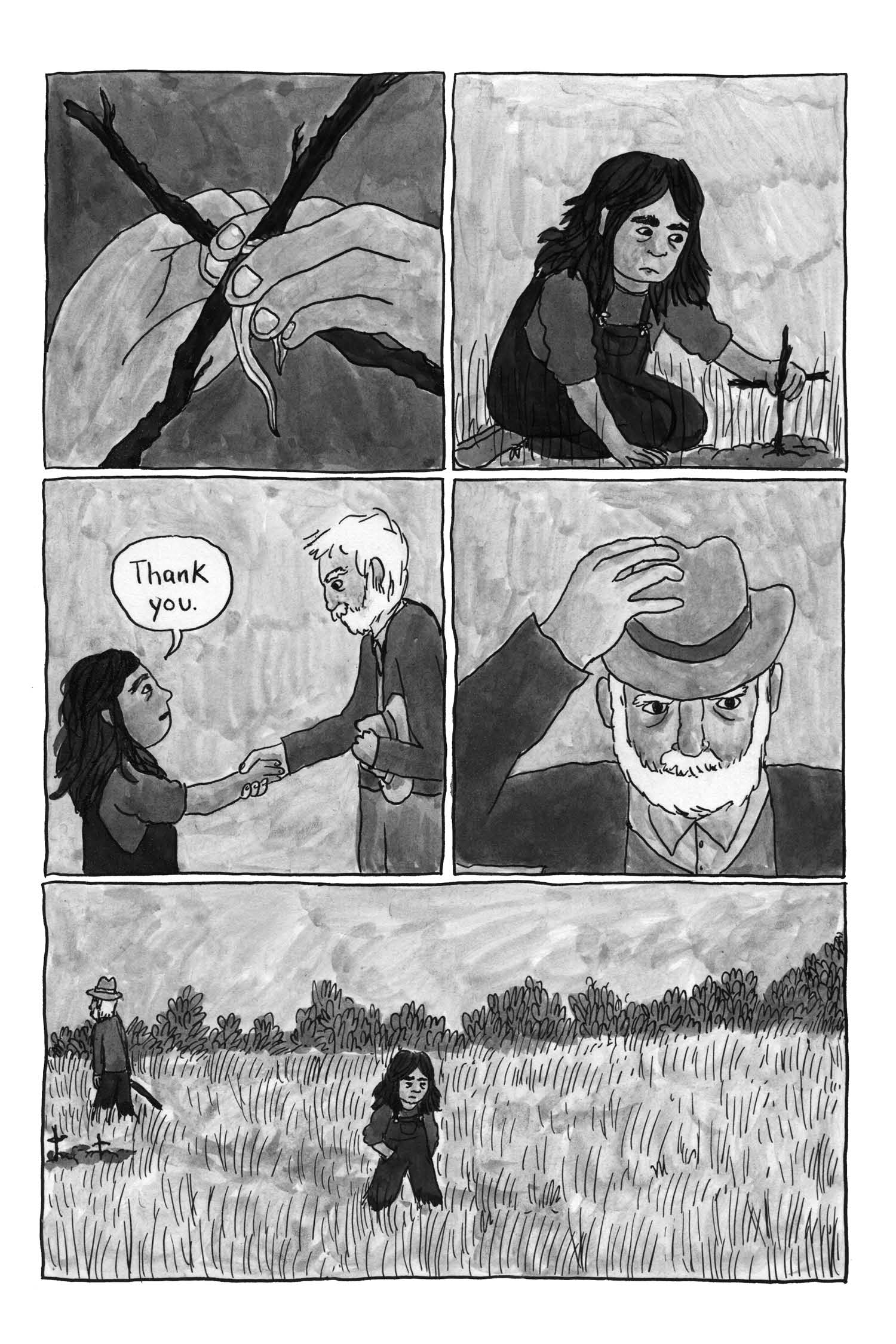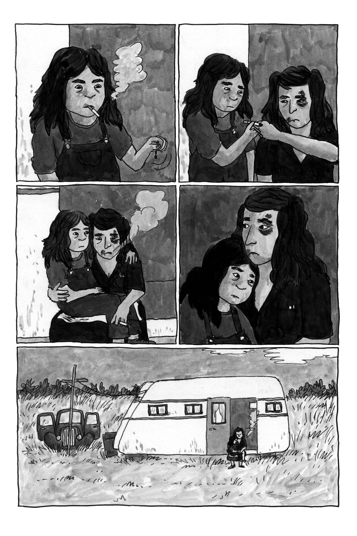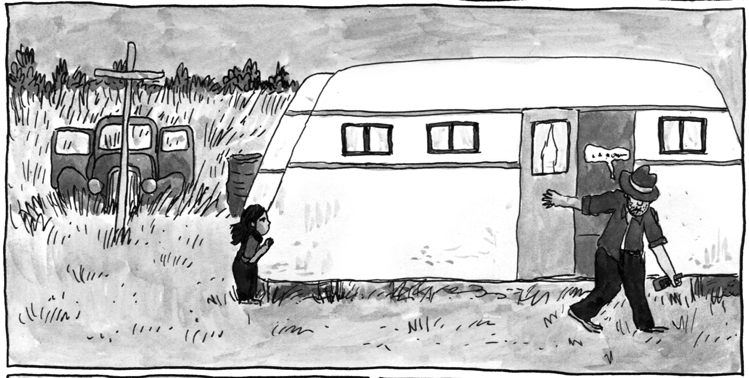A work of fiction inspired by her grandfather’s writing and childhood, Melissa Mendes’ pastoral cartooning captures the openness of rural America—soft breezes, tall grass, whirring grasshoppers, rainstorms, skinned knees. But all the while, the cruelty, the disappointment of man lurks behind the barn and in the trailer. Life can be stubbed out as easily as a cigarette tossed in the dirt. One moment all focus, next, gone without a thought. Will Edie find herself repeating a cycle or will she be free like she felt as a child?