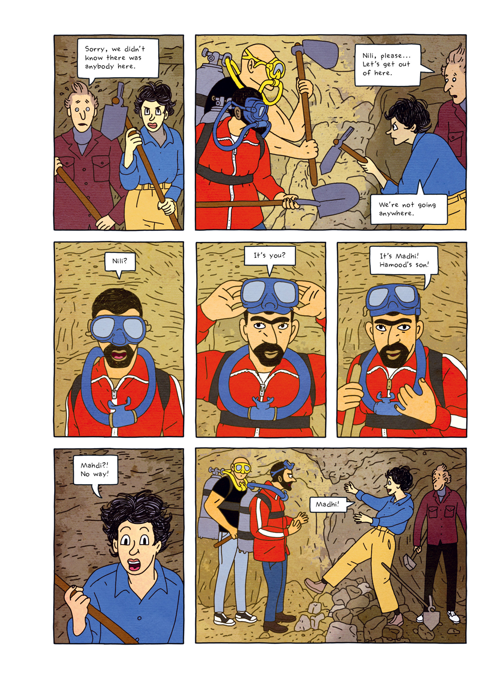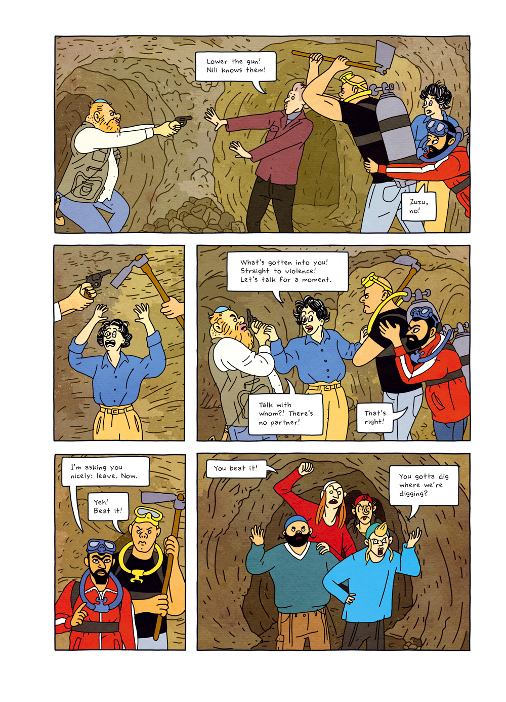 "Through exuberant wit, wisdom and genuinely cinematic verve, Modan’s Middle-Eastern intrigue grabs us from the very first panel and never lets go. A colorful cast of passionate, exasperating and eccentric characters, all flawed yet somehow loveable, enliven Tunnels’ riotous plot. With constantly surprising twists and turns, Modan packs a great deal into this slyly subversive, highly entertaining story—a rancorous family, the mis/uses of archaeology and the mythical past, messianic zealots, human greed, and the tempest of current Israeli-Palestinian relations—and yet it all brilliantly succeeds, with dollops of rich human comedy leavening her very serious themes. The most deliriously inventive and daring graphic novel in recent memory, Tunnels triumphs as the perfect adventure story for thinking adults.”